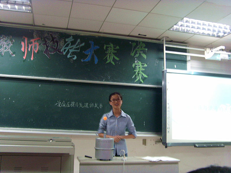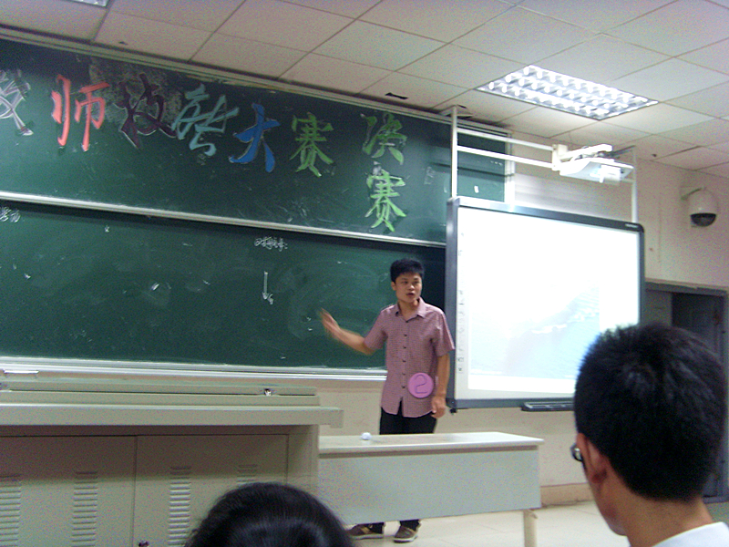 伴随着简短的选手视频和悠扬的音乐,比赛开始了。本次比赛分为三个环节:模拟课堂、智力大比拼和有问必答。第一环节中,十位选手走上讲台,结合自己的PPT,在规定时间内完成授课。搞笑的视频、有趣的实验、活泼的讲课,真是引人入胜。其中印象最深刻的是2号选手张波。他的主题是“浮力”,以航母为例开始,知识慢慢渗透,整个过程流畅完整并层次分明。这都源于他的扎实知识基础和丰富的授课经验。稳重的风格,细致的讲解,明确的知识点分析,让我们看到了他优秀的教学素质。但他的发音和语言的活泼性还需努力锻炼,这样才能让课堂更加丰富多彩。以后的几位选手都有精彩的表现,纸团落体实验、乒乓球漂浮实验、光折射实验,都深深地吸引着全场观众。