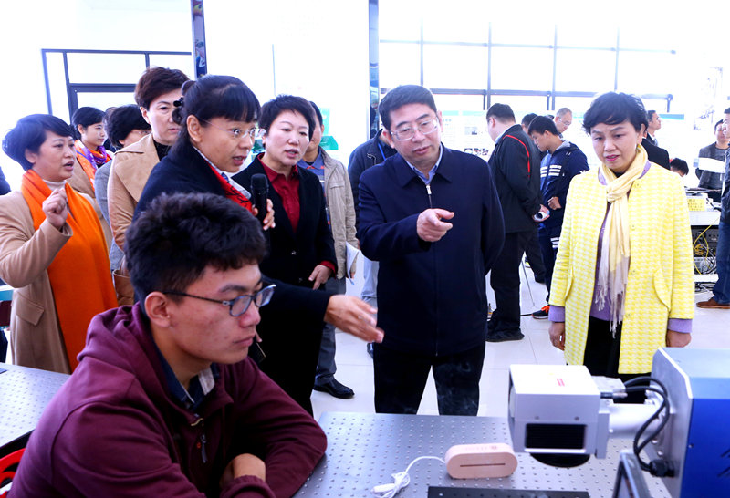 王路副省长还听取了我院院长彭鸿雁教授对学院自研的光电信息工程专业学生实验设备和激光加工设备的介绍,现场观看了激光打印技术,指出科研成果要尽快转化,要与美术学院艺术设计相结合,开发黎锦元素等艺术品投入生产。