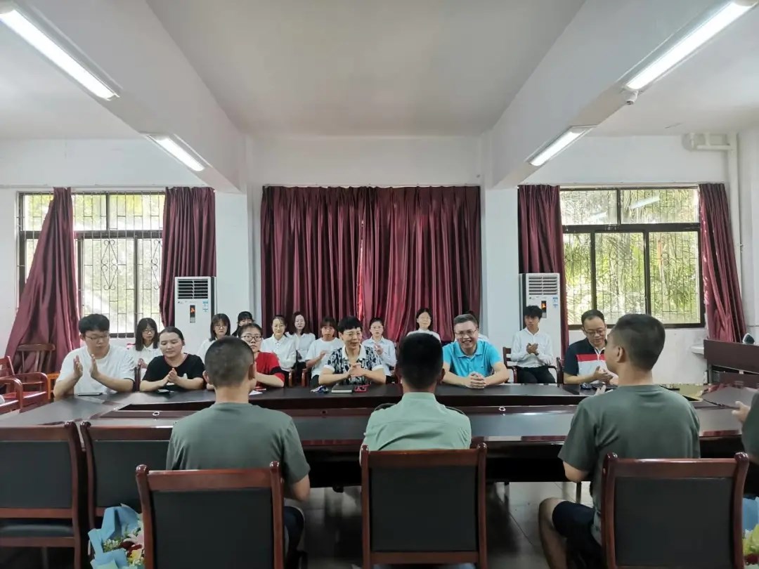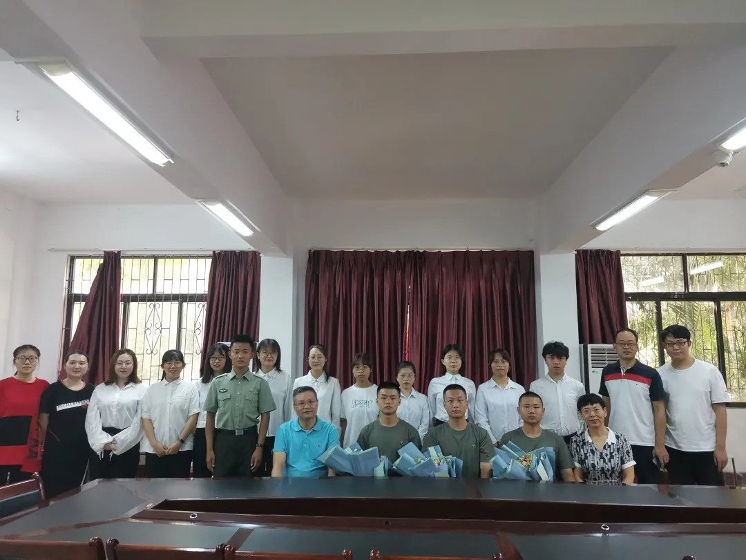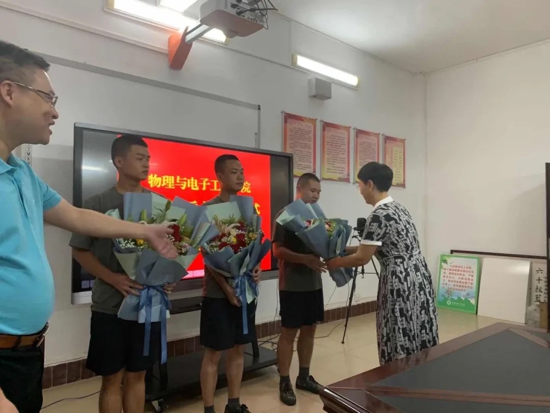 彭鸿雁院长给三位新兵献花以表祝贺,并表示:部队是一个大熔炉,新兵们要有迎接各种历练的心理准备,增强集体精神和团队意识,做一名合格的军人,并怀揣梦想,锻炼成一块好钢!随后,退伍返校的王毅恒同学也向三位新兵分享了一些部队心得:部队生活磨炼自身意志。希望新兵同志秉承“少说话,多做事”的理念,先提升自身能力,再突破自我实现梦想!