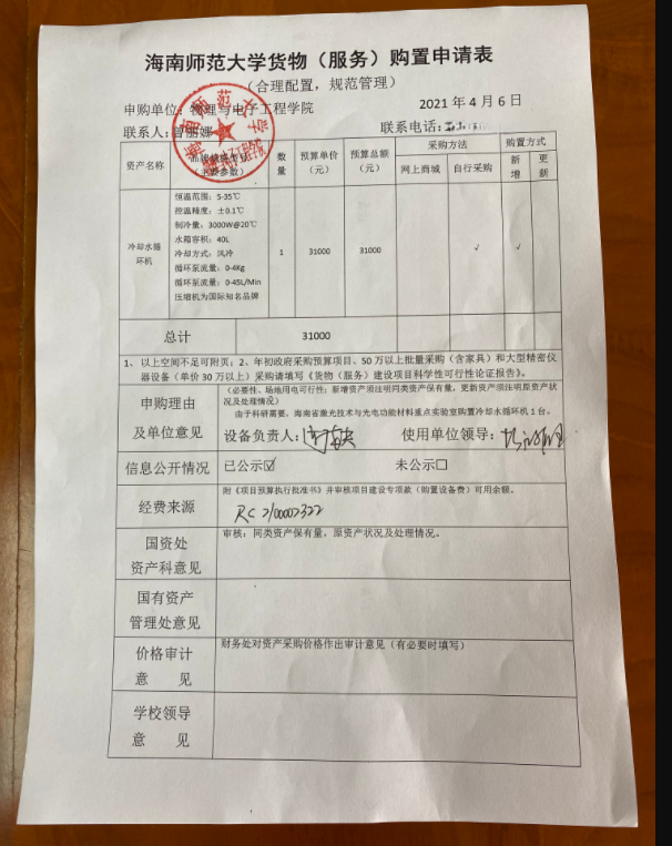 我院海南省激光技术与光电功能材料重点实验室因科研需要购置冷却水循环机一台,特此公示。公示时间2021年4月14-16日。