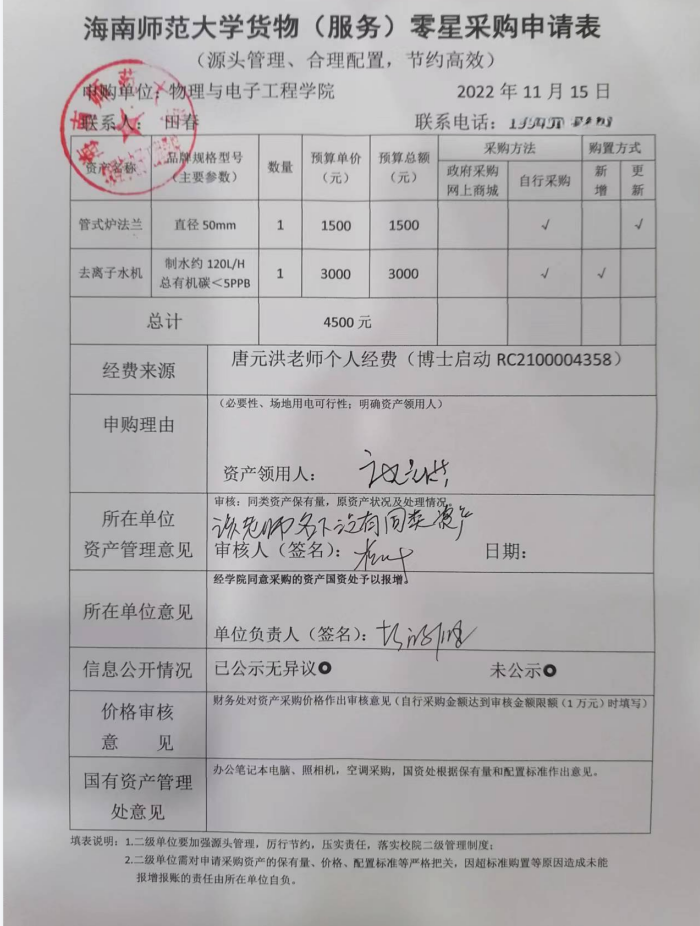K云体育官方入口唐元洪老师急需采购实验室设备,公示如下,公示时间:2022年11月15日-11月18日。