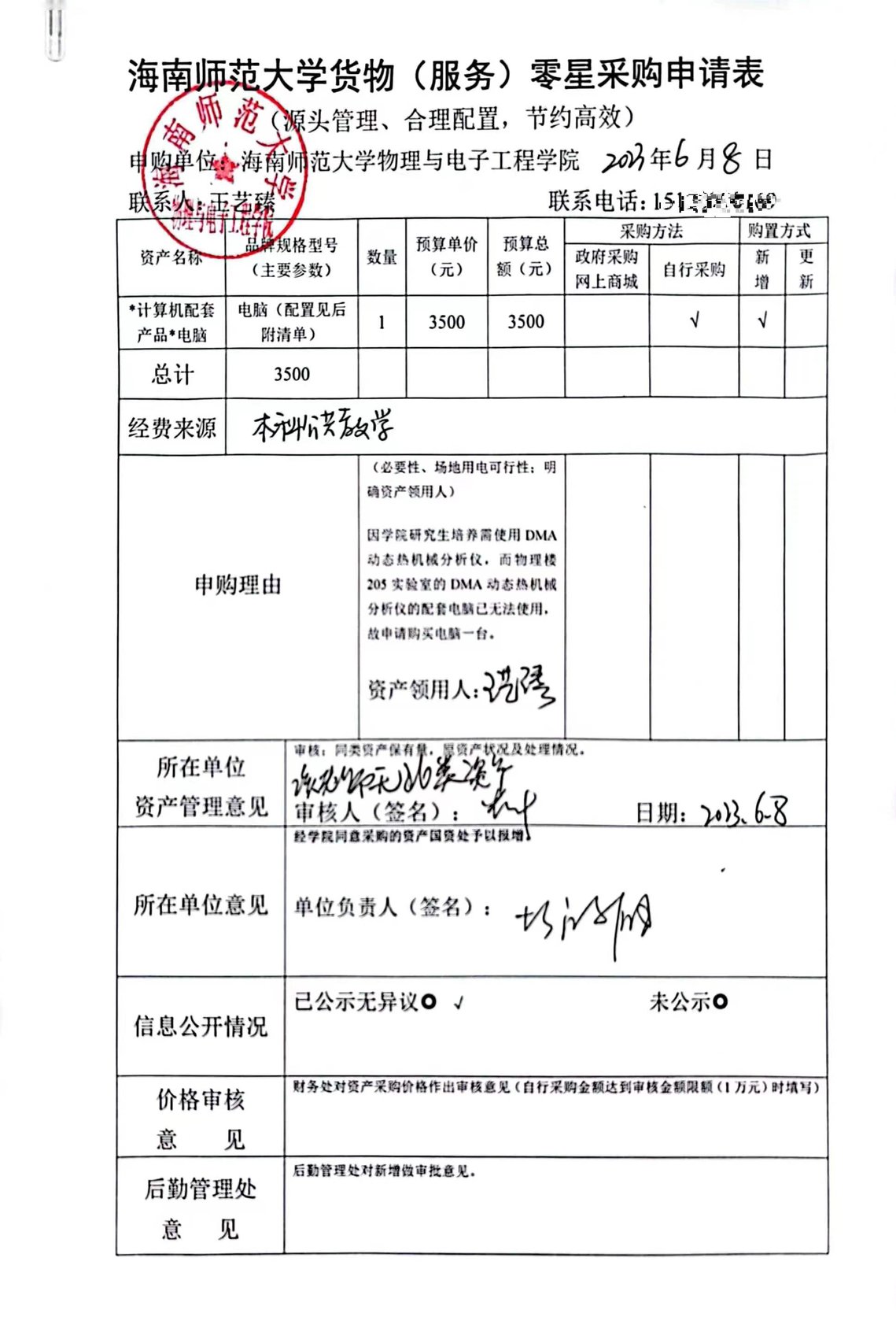 K云体育官方入口王艺臻采购实验电脑设备一台,公示如下,公示时间:2023年6月8日-6月12日。