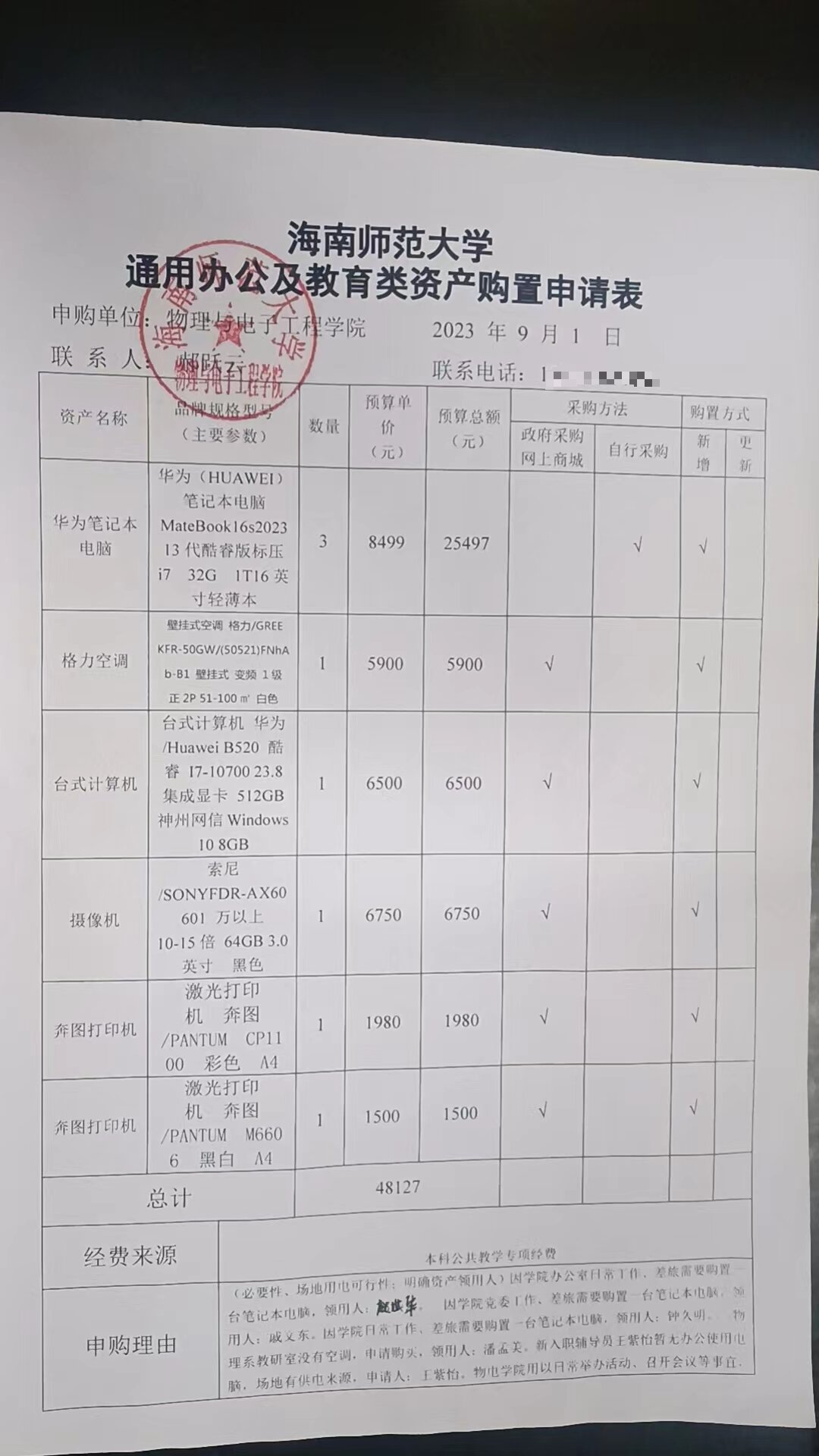 K云体育官方入口因日常办公需要,购买笔记本电脑三台,台式电脑一台,格力空调一台,摄像机一台,打印机两台。公示时间:2023年9月26-10月7日。