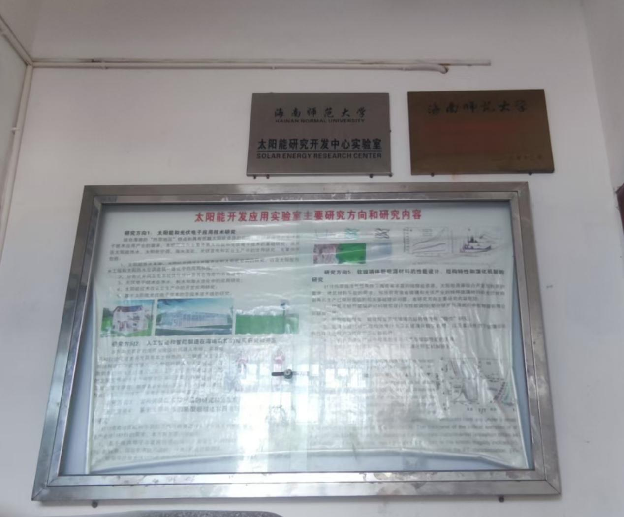 海南师范大学太阳能研究所,成立于1995年,是率属海南师范大学的一所校级研究所,主要服务于海南师范大学二级学科(太阳能利用开发)的学科发展,以及海口市和海南省太阳能学科和产业发展建设。海南师范大学太阳能研究所作为海南省唯一“新能源和太阳能领域”校级科研院所,1996年曾经接待过美国国际阳光电力公司的考察人员,并于1996年参与了西沙永兴岛的太阳能发电、海水淡化、太阳能热水等项目的研究,同时参与设计并指导施工过多个海南省的太阳能热水系统工程。2016年重新任命了所长、副所长人选,研究所各方面的工作得于全面开展。2017年海南师范大学太阳能研究所的太阳能开发实验室获海口市科工信局批准成立海口市太阳能光伏应用技术重点实验室,同时与企业联合创建了机器人联合实验室、海南硬件工程中心、海南太阳能灭虫灯研究中心等。