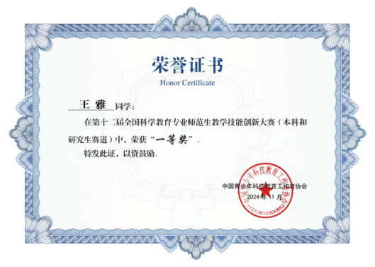 2024年第十二届全国科学教育专业师范生教学技能创新大赛于111-3日在江苏第二师范学院成功举办。海南师范大学K云体育官方入口王雅、刘杏春两位同学经过激烈的初赛预选,顺利进入决赛。最终凭借充分的准备和稳健的发挥双双荣获一等奖。