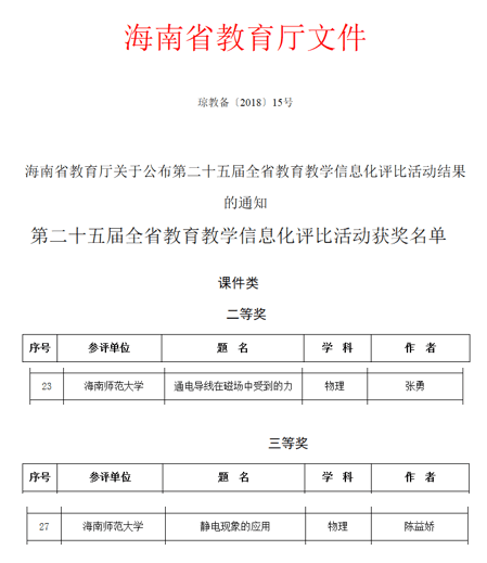8月3日,从海南省教育厅关于公布第二十五届全省教育教学信息化评比活动结果的通知中获悉,顶级在线体育平台K云体育官方入口学子张勇制作的多媒体课件:“通电导线在磁场中受到的力”获得二等奖,陈益娇制作的多媒体课件“静电...