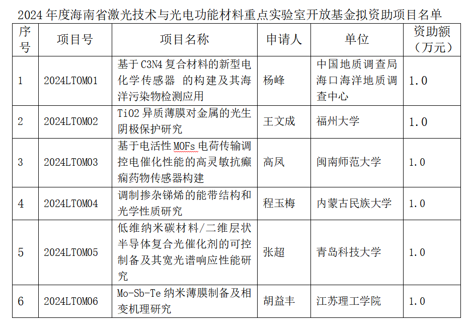 2024年度海南省激光技术与光电功能材料重点实验室 开放基金拟资助项目公示