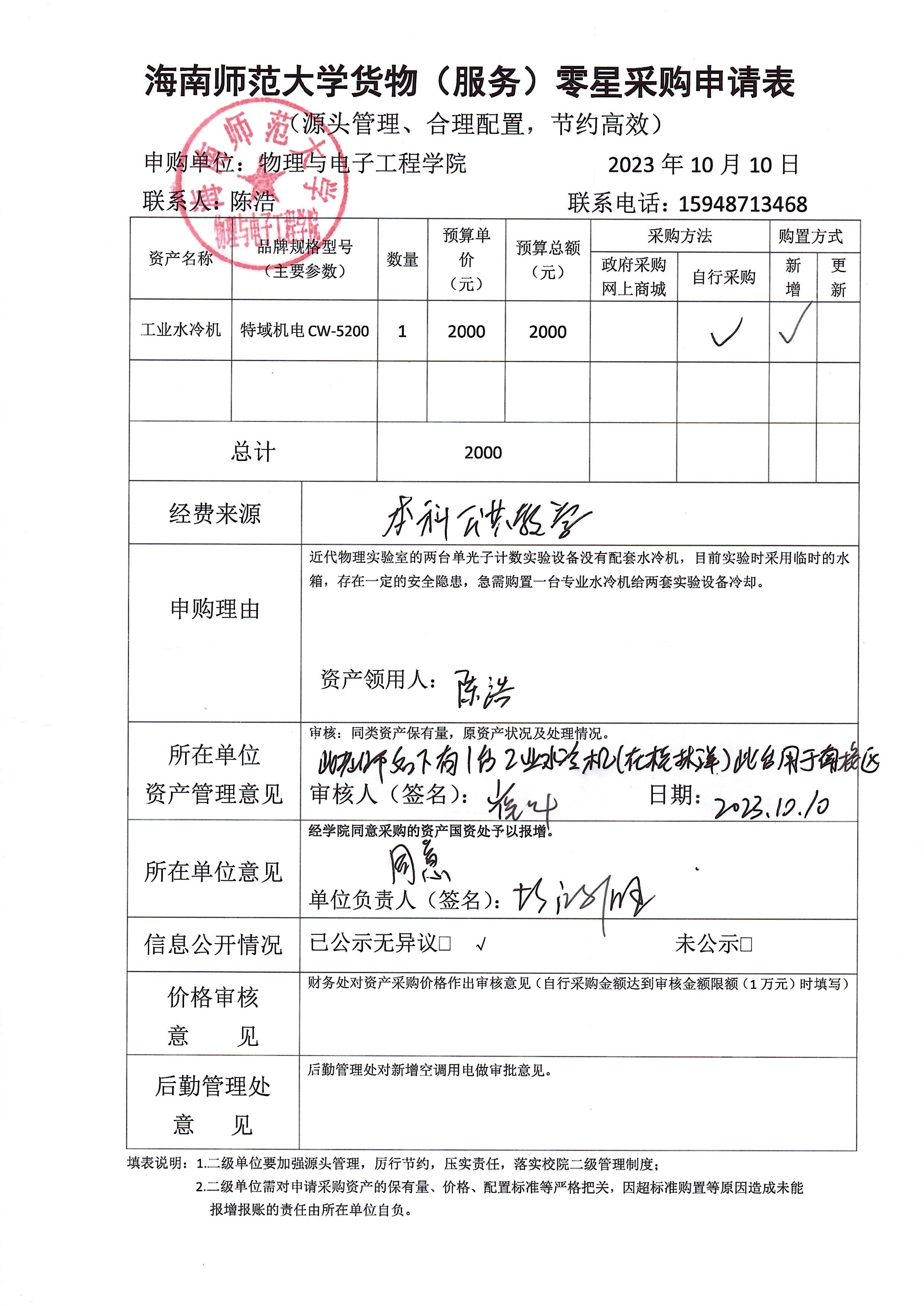 K云体育官方入口陈浩老师采购实验设备,公示如下,公示时间:2023年10月10-10月13日。